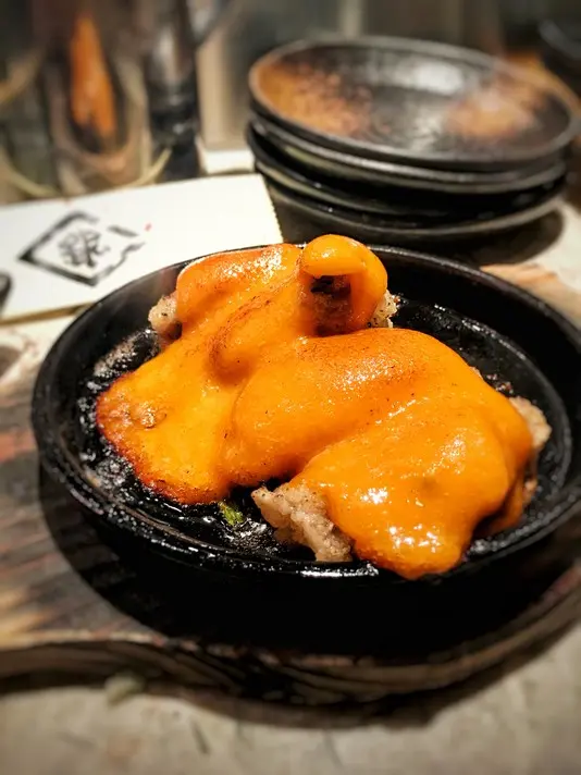 醉翁之意本在酒,原本說只吃少許東西的友人,嚐過一口海膽汁燒蠔後,馬上改變主意。海膽汁燒蠔是這裡的名物,香口炸蠔放在灼熱鐵板上,上桌時枝枝作響,配上香濃海膽汁,每一次都不會令我失望。