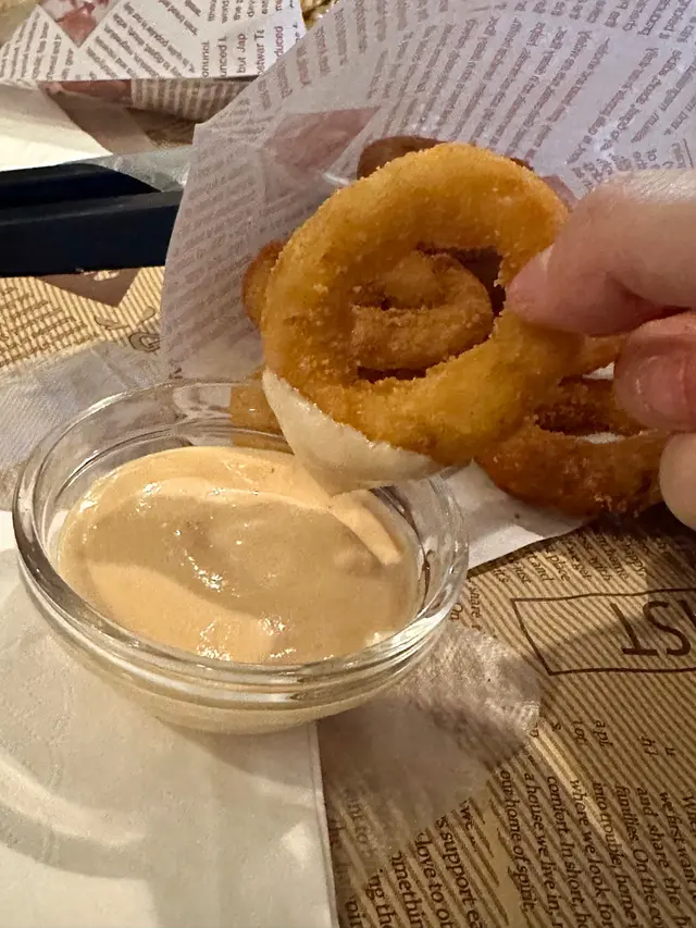 洋蔥圈炸得好乾爽,唔會一咬成口油,脆漿夠薄夠脆,入面洋蔥仲保持到水分同甜味,點少少佢哋自家製嘅醬汁食,送漢堡一流