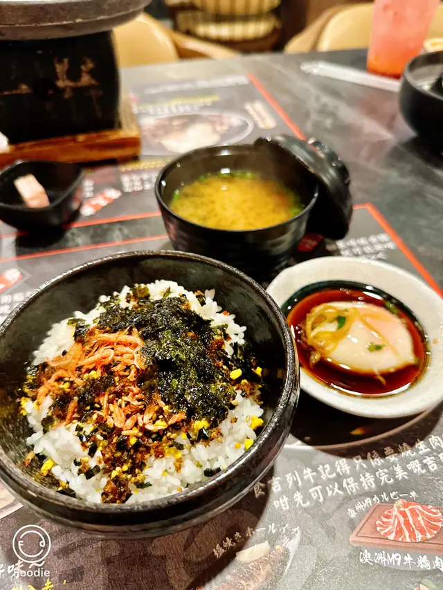 加錢可配溫泉蛋、麵豉湯及味素飯!滿滿味素的日本米飯,加上香滑溫泉蛋蛋汁,入口充滿蛋香
