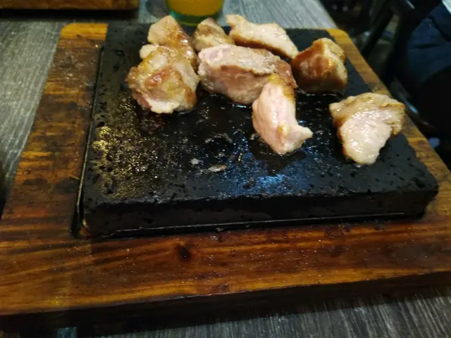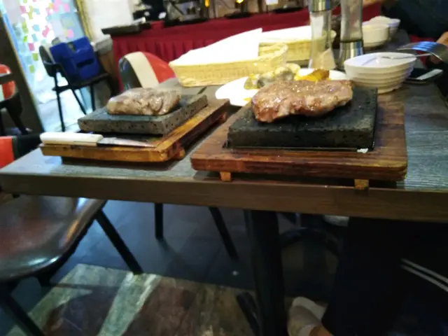 主菜只有一款是豬扒,其餘都是牛扒,我不喜歡牛扒,於是選了黑毛豬扒,豬扒比較厚而慢熟,上菜時仍未夠熟,要靠石板慢慢讓它煎熟,味道不錯,比起鐵板另有一番風味。