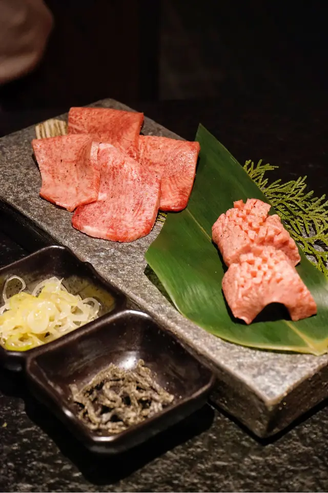 第一個部位係兩款唔同切法嘅牛舌。薄切嘅特上厚切牛舌比較爽身,適合加上洋蔥絲一齊食用,口感會特別多汁。而厚切牛舌就肉味較濃,適合同昆布絲卷埋一齊食。