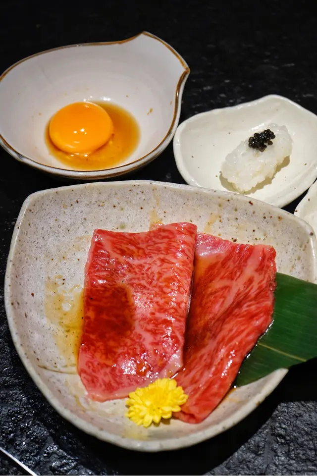 最後一個牛肉當然要反高潮,呢個部位油份又會多番。有兩種食法,首先燒完神戶牛,將神戶牛放喺黑魚子壽司上面,再點入攪拌均勻嘅蛋漿。第二種方法就係神戶牛預先點上蛋漿,再放入壽司上面。兩種方法都有唔同嘅風味。