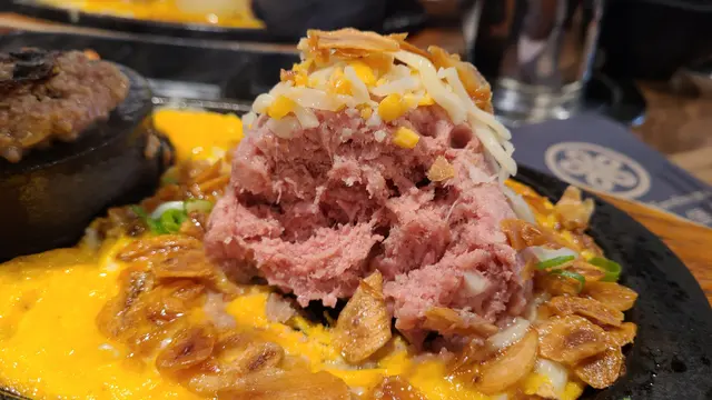 菠蘿煙肉和牛漢堡扒用鐵板上枱,有個大大個和牛漢堡肉球,加上雙色芝士碎同6塊煙肉,撒上蔥花。下底墊有加咗芝士既蛋同4件菠蘿。餐廳特別在於供應爐具比客人自己煎漢堡。塊鐵板係有一舊熱石係角落位置,自己馬上動手用鏟起生和牛漢堡就煎,每三秒就要反一反。我覺得外面燶燶地而入面生生地就最正,外脆內嫩,和牛係選用100%澳洲和牛,肉質好滑。到後期鐵板唔夠熱仲可以換塊熱既。煙肉唔會太鹹,都好鮮味。呢個蛋有芝士,滑溜好食又流汁。芝士加落漢堡扒一齊燒實在係太邪惡,芝士仲可以拉絲,真係好好食!菠蘿酸酸甜甜,又可以減輕油膩感。