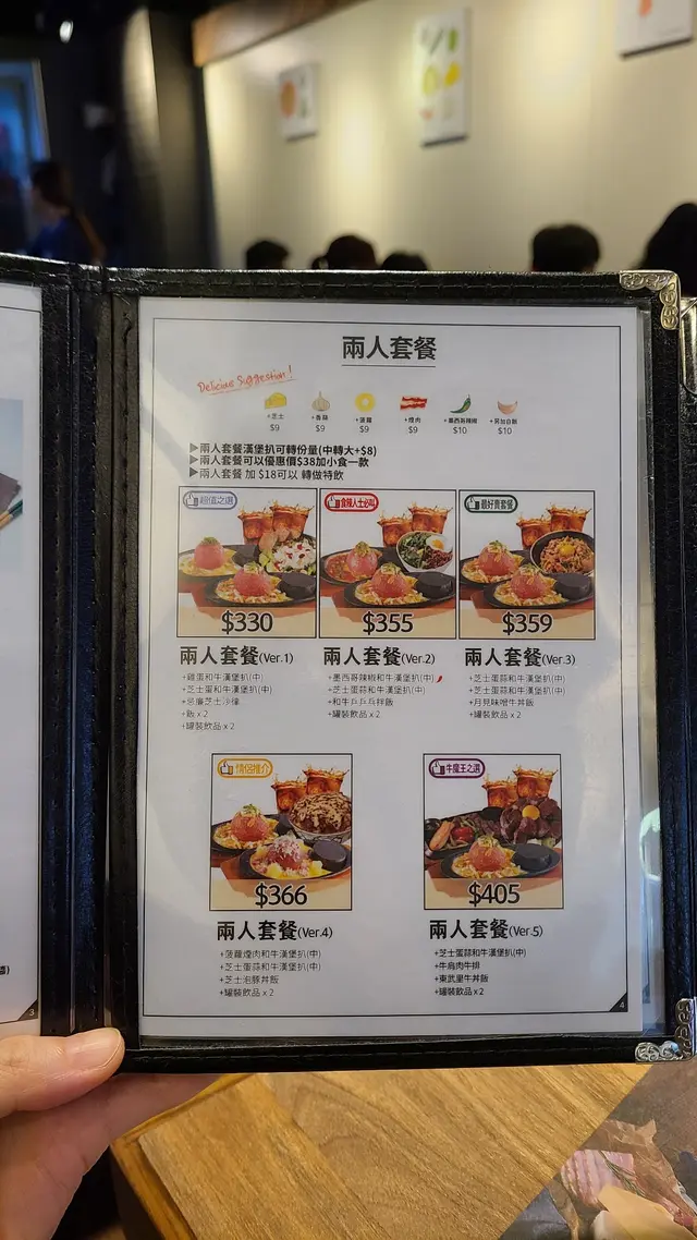 餐牌:漢堡扒一共有6款口味揀,每款仲有3個size選擇,分三個價錢。除左漢堡扒,餐牌都有石燒牛扒、飯、沙律、意粉、小食同飲料,仲有多款兩人套餐。落單用QR code。