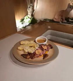 擺盤精美嘅日式料理,烤過嘅和牛帶焦香味,肉質嫩滑,有肉汁,肉味濃厚,與炸至金黃香脆嘅日本南瓜很配,沾上羊肚菌汁,味道層次更提升。