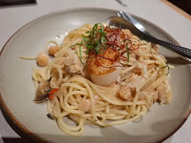 依碟海鮮材料豐富嘅意粉,帶子煎至外脆內軟,榮螺肉質爽口,貝柱鮮味鹹香,意粉帶點煙韌,食起嚟有咬口,調味微辣,加入蒜片更惹味。