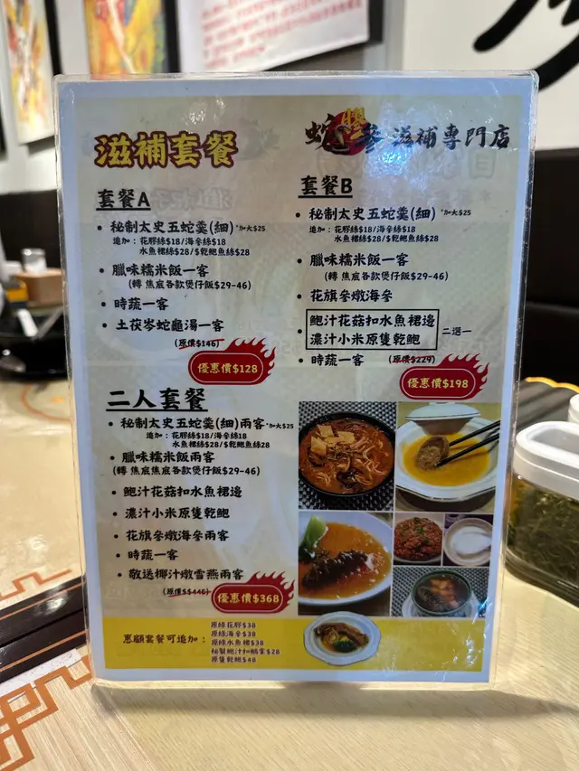 二人套餐好豐富!有齊蛇羹、臘味糯米飯,而且仲有鮑汁花菇、原隻乾鮑、花旗參燉海參、雪燕等,滋補又暖身!
