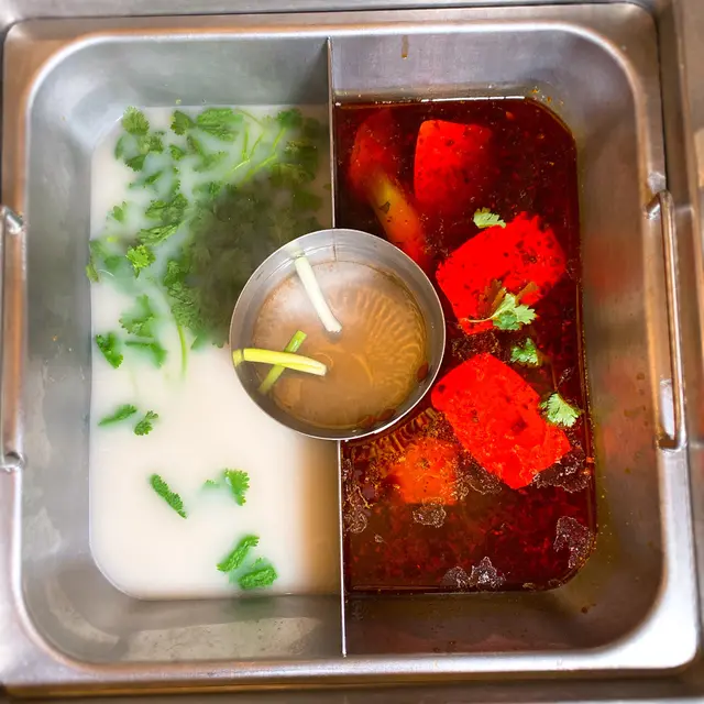 紅湯便是麻辣湯底,花椒辣椒的份量相當多,令辣到十足味道濃厚。另一款選擇了芫茜皮蛋湯,芫茜營養價值高,覺得太辣時可以吃來舒緩一下味蕾。