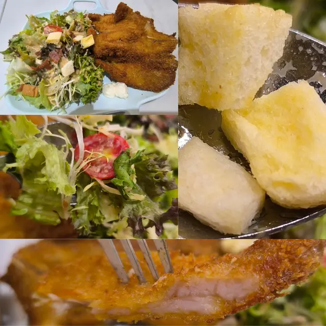 呢碟吉列豬扒配田園沙律真係好大碟,吉列豬扒有成人手掌咁大,炸得好脆,炸粉唔算多,豬扒唔會韌,沙律菜新鮮多汁,仲有番茄仔同炸麵包粒,我仲揀咗芝麻醬,其實有兩種醬可以比人揀,芝麻醬同黑醋醬或無醬比人揀,下次再經過粉嶺試下黑醋醬先!