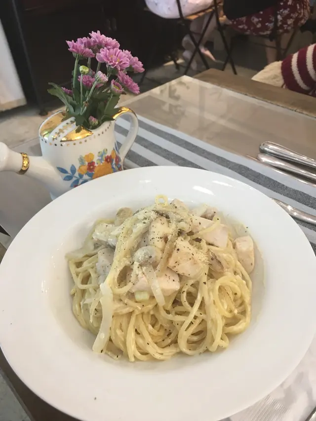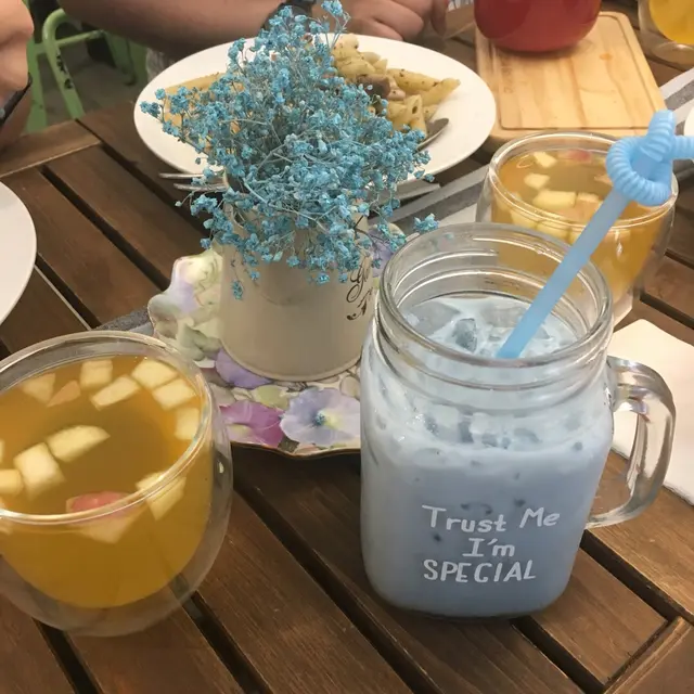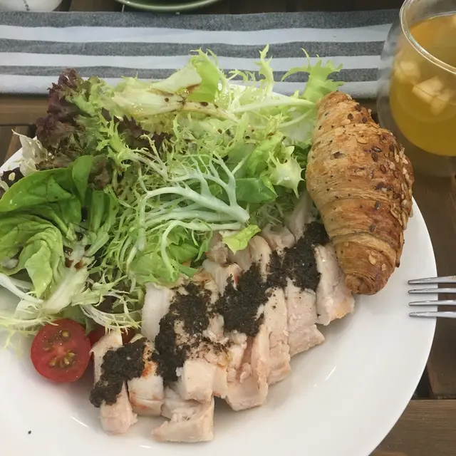 由於人多訂左檯,所以餐廳一早就放低左隻熊仔陪食,入面環境真係唔錯,完全同出面係2個世界(出面有地盤起緊樓),都係一般cafe menu,主食都係沙律/意粉,由於果朝隊長食左個豐富早餐,飽到下晝,所以叫個雞肉沙律食,其他同事叫左意粉,夾左2舊試下,無乜味道,跟餐有湯,仲可以揀$38以下的飲品,好抵喎,因為可以揀果茶飲,我叫左個蘋果茶飲⋯⋯嗯,完全飲唔到有蘋果味,果肉還果肉,so call茶既野就好飲用柚子蜜果d野沖出黎,可能我諗多左,以為係一壺茶葉茶+蘋果肉😑