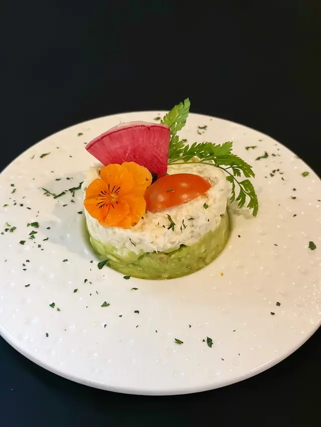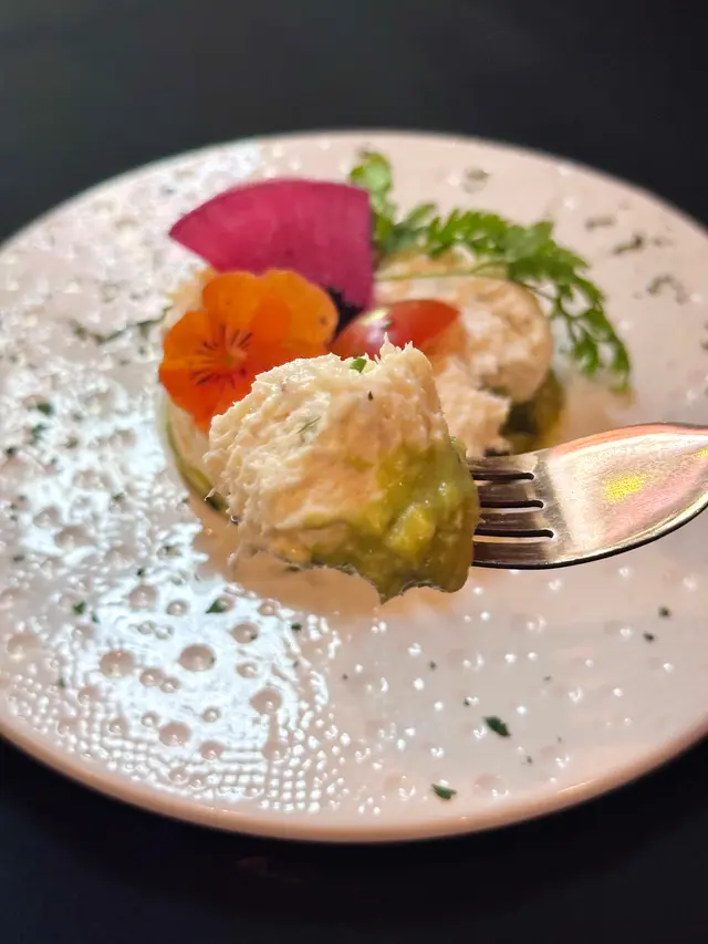 煙燻蟹肉牛油果他他 : 牛油果蓉口感非常綿滑,配上大量蟹肉撈埋一齊食,鮮味十足