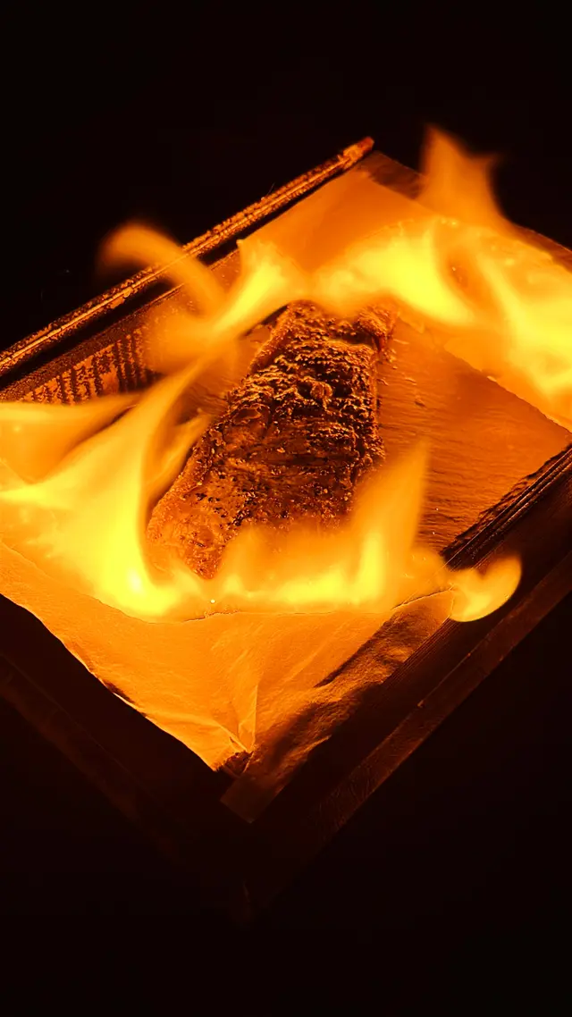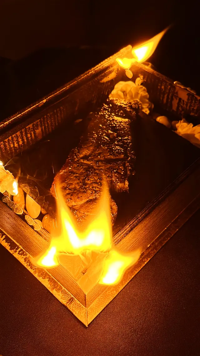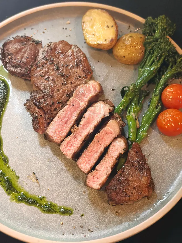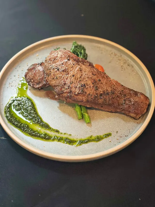 10oz 美國頂級西冷牛扒 : 賣相非常吸晴,用一木盒載住,再點火變出牛扒,儀式感滿分,選擇左五成熟,西冷牛扒煎得金黃,肉質粉嫩,牛味濃郁,蘸少少青醬更能提升味道,再配上多款新鮮蔬菜,非常完美嘅配合
