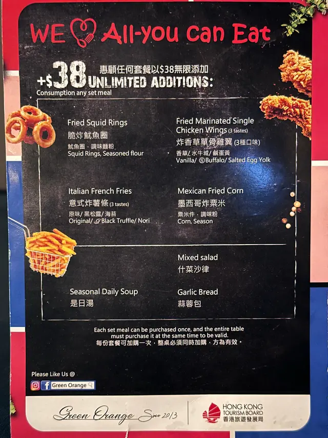無限添加小食 : 只要每位同枱套餐加 $38 就可以無限添加小食有齊脆炸魷魚圈、墨西哥炸粟米、鹹蛋黃炸香草單骨鷄翼、黑松露意式炸薯條、雜菜沙律、蒜蓉包及是日餐湯,夠曬豐富,必加之選