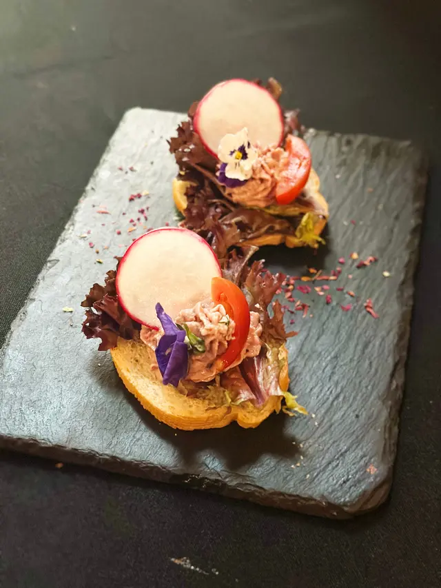 法式鵝肝醬多士 : 鵝肝醬味道濃郁,配埋新鮮沙律菜及鬆脆多士,搭配白酒一起享用,風味更佳