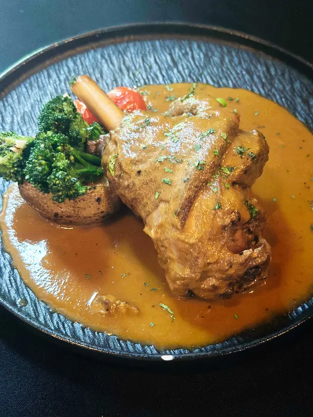 法式紅酒燉羊膝 : 羊膝用紅酒、高湯等一起慢燉至羊肉軟嫩,骨肉分離,嫩滑入味,味道濃郁,配上多款新鮮蔬菜,必點主菜之一