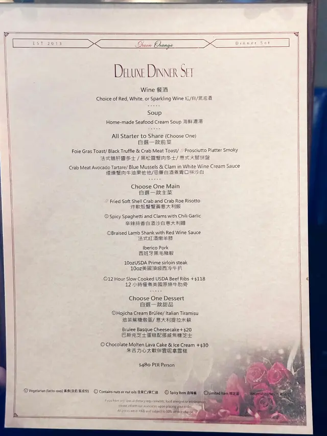DELUXE DINNER SET 包括一杯餐酒、餐湯、前菜、主菜及甜品
