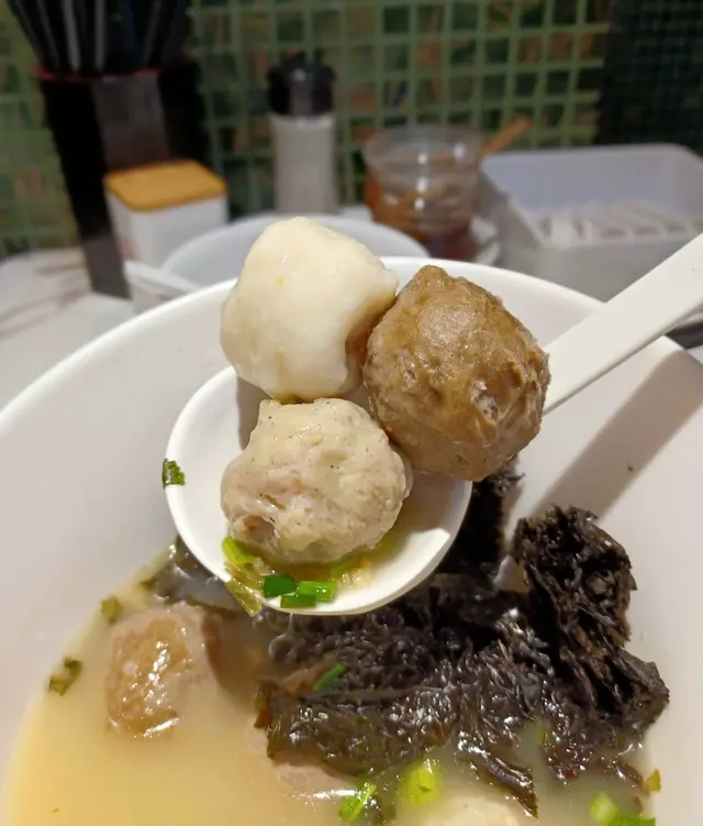 三種肉丸各有特色:墨魚丸爽口有鮮味;牛丸有質感,牛肉味濃;豬肚丸最有特色,粒粒豬肚有口感,配上黑胡椒,香味濃郁,是獨特富有創意肉丸,真材實料,再配上鮮味紫菜,令味道更提高一層次。