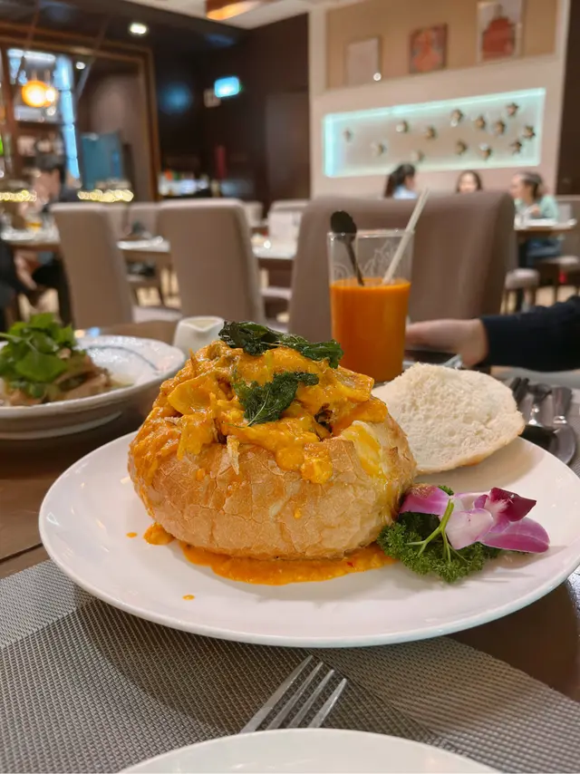 咖喱炒軟殼蟹麵包🥯用麵包裝住軟殼蟹🦀洋蔥🧅蛋同蔬菜🍳🥬咖喱味道微辣🍛麵包索晒咖喱汁👍🏻麵包外脆內鬆軟😗