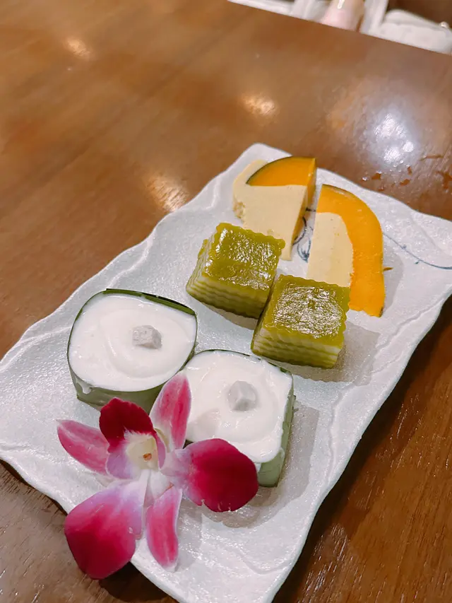 甜品拼盤🍽️有南瓜布甸🍮千層糕、椰汁西米糕🥥布甸味道有啲似燉蛋🥚配上綿滑南瓜🎃千層糕煙靭軟滑😆充滿斑蘭香🌱椰汁西米糕椰汁味香濃😌底下仲有芋頭粒💜