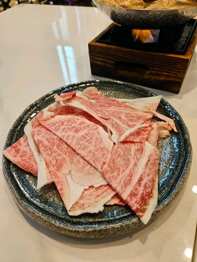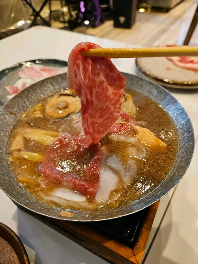 鍋物裡有粉絲,菜,菇,大蔥等,可以任食豚肉火鍋片,安格斯牛肉火鍋片,另外加購A4和牛片火鍋片只需要88元,加購的牛和肥肉均勻,非常優質!入口即容😍