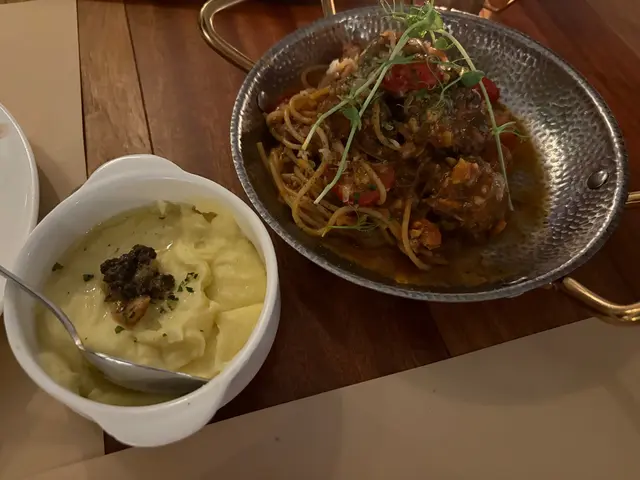 番茄醬牛肉丸,圓潤飽滿的牛肉丸臥在鮮紅的番茄醬中,醬汁濃稠得能輕輕掛在肉丸表面,肉丸緊實彈韌,肉香混著番茄的酸甜瞬間在口中炸開。