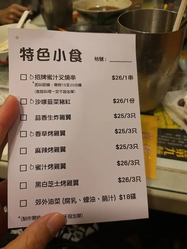 排隊候位時已先畫好點菜紙,我選的組合是「鹵水大腸+蠔仔煎蛋+辣味魷魚+油麵配腩汁」,另一碗是「南乳豬手+金錢牛肚+柱候牛腩+蒙麵」。今晚3人用膳,所以還點了3款小食share,有招牌蜜汁叉燒串﹑香草烤雞翼及沙嗲韮菜豬紅。