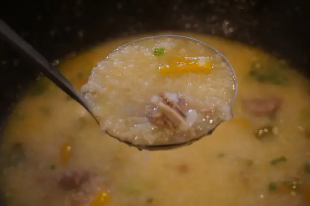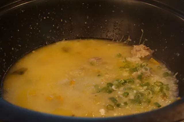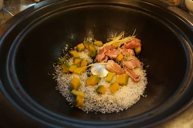 最後揭開蒸鍋:就是南瓜滑雞粥底。將剛才的海鮮、肉、菜的「真・鮮・味」統統濃縮在一鍋粥底裡。識食一定把肚子留給精華中之精華,多麼有層次的海鮮湯雞粥,暖胃飽肚之餘,還有一陣陣鮮甜的餘香。人人大愛!
