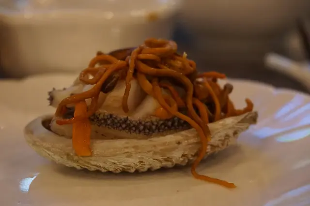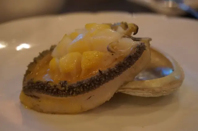 第一味的海鮮是南非鮑魚,簡約而矜貴。用上健康蟲草花清蒸,將最新鮮的鮮甜逼出來。鮑魚煙韌有𡁻口,吃出來是鮑魚本身的味道,沒有多餘的調味,突出了大廚對食材新鮮度的信心!