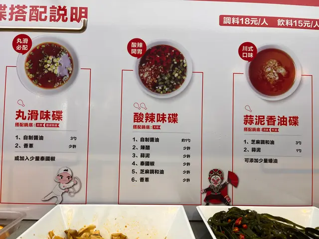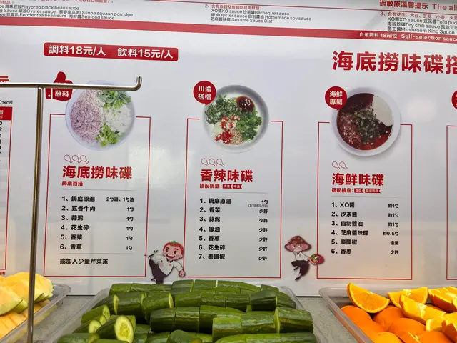 自助火鍋醬料區($9 / 位)的款式超過20款,真係諗得到嘅都有齊;又有七款味碟搭配說明,對於有選擇困難症的客人好大幫助。另外,吃完火鍋,還有免費水果;有切片橙、蜜瓜及小黃瓜任由食客享用。