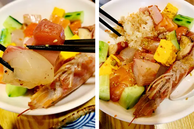 通常呢個價錢嘅雜錦魚生丼飯,都預咗係角切魚生。嚟到反而有驚喜,雖然望落都係角切魚生,但係好大粒,我覺得其實係厚切粒狀,並唔係切剩刺身嘅頭頭尾尾,三文魚、鱆紅魚肥美、仲有八爪魚、赤海老、蟹籽、玉子同青瓜,份量多,食完飯啲魚生要空口食。如果再想要多啲飯,係可以向店員加嘅。每樣都好新鮮,呢個價錢非常抵食。