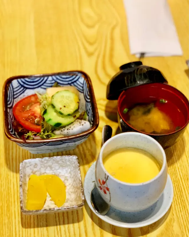 所有午市御膳已包括:前菜、沙律、味噌湯、茶碗蒸,蛋蒸得好滑,裏面有鳴門卷同粉絲。雖然食得有點衝鋒陷陣,但係都非常滿足。