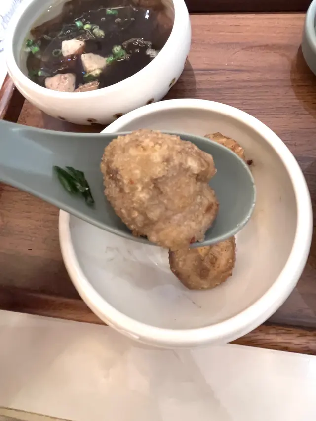雞肉大大粒,炸粉脆口,雞肉入味Juicy,地瓜味道甜蜜,酥炸得外脆內軟,口感煙靭彈牙,紫菜湯滿滿我喜歡的紫菜,同貢丸味道出奇地夾 。