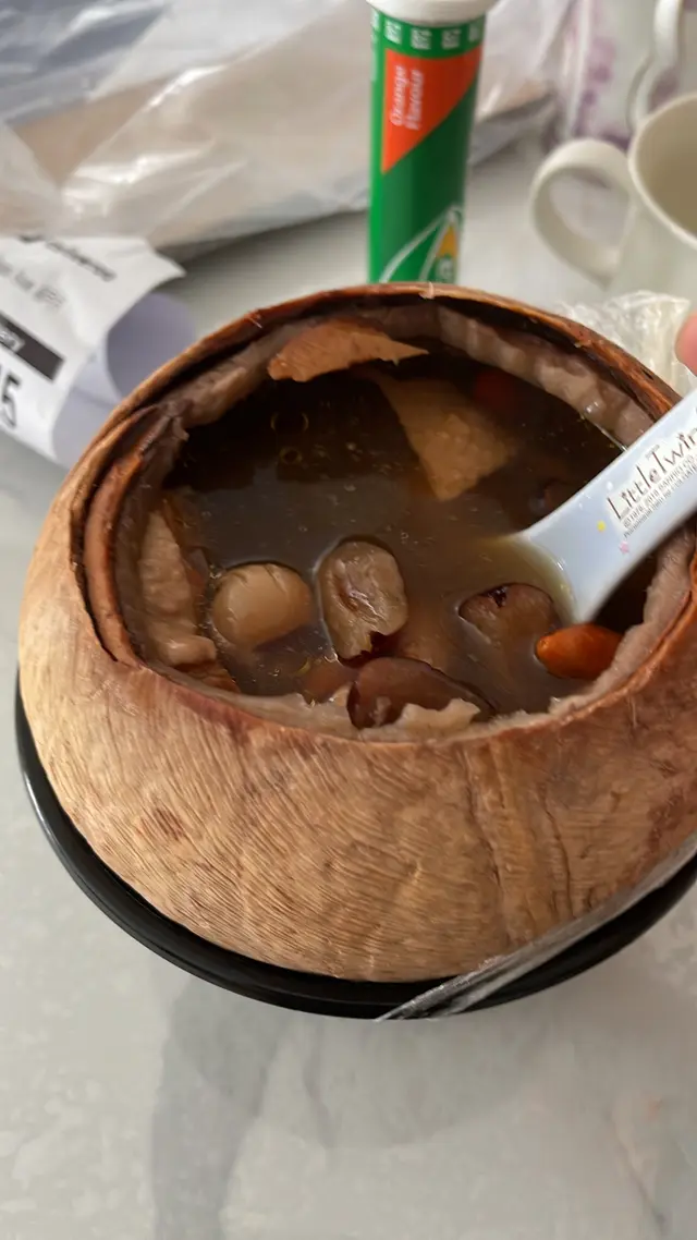 一打開個椰皇 好香 頂蓋嘅椰肉已經燉到好冧 輕輕刮就食用椰肉 啲湯入邊勁多料 又瘦肉 有雞 有桂圓 紅棗 杞子 飲落個湯好甜