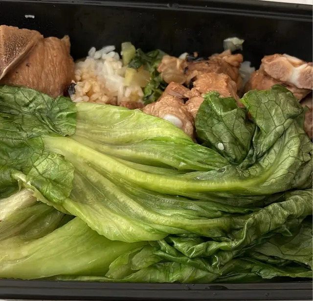跟住試個飯 佢有生菜幾條 個飯底都仲係菜飯 個排骨都好冧