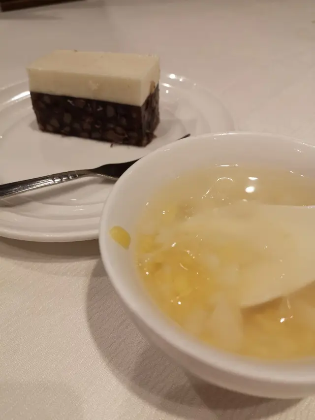 晚飯仲有甜品送,椰汁紅豆糕, 落足料粒粒紅豆又香又甜, 做有陣陳皮香 。椰汁糕嗰層滑溜溜也充滿椰香, 傳統粵菜竟然也有出色甜點! 冰凍馬蹄綠豆爽夠夠清潤, 消暑解膩一流!