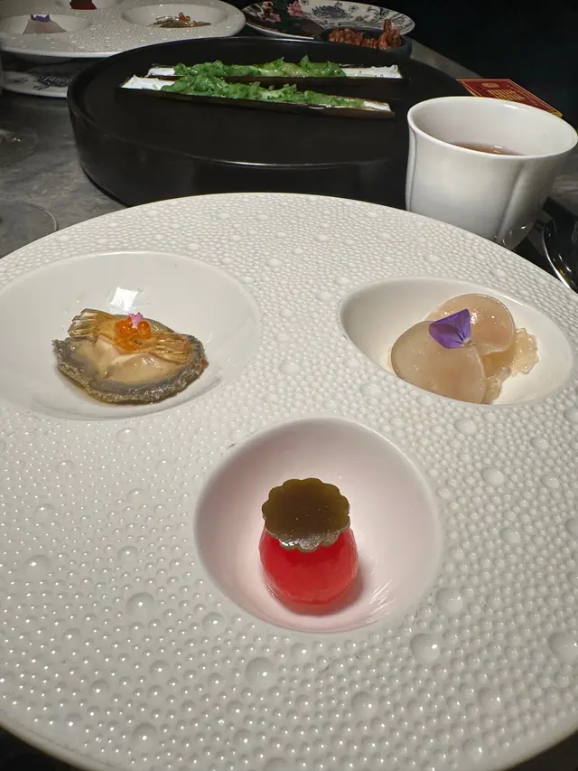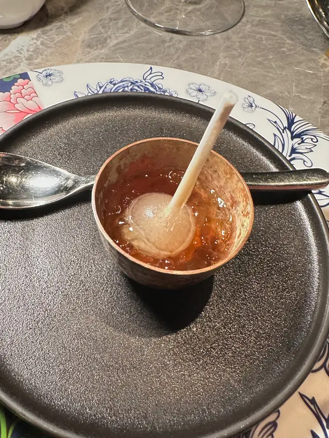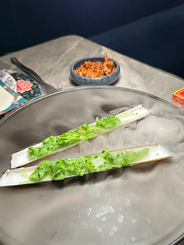 作為第一道前菜,已經充滿儀式感,用乾冰營造出視覺效果。藤椒的麻香和蔥油的鮮香為蟶子皇帶來層次豐富嘅味覺體驗。