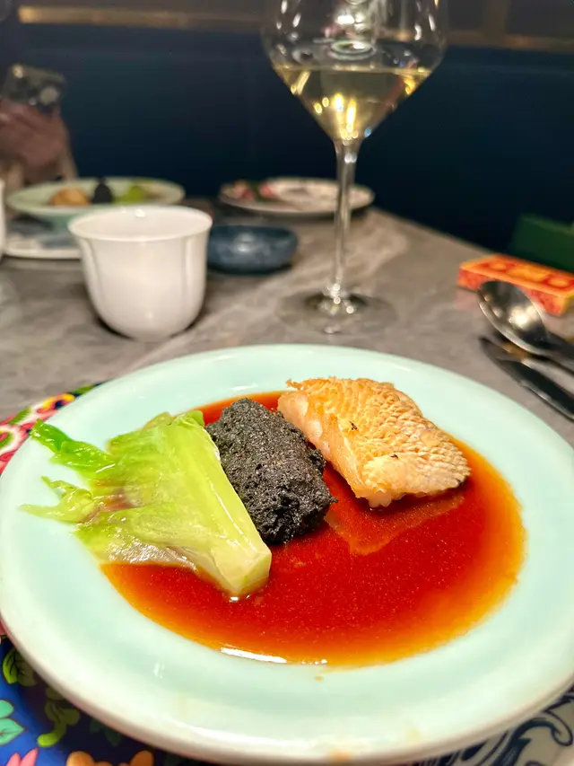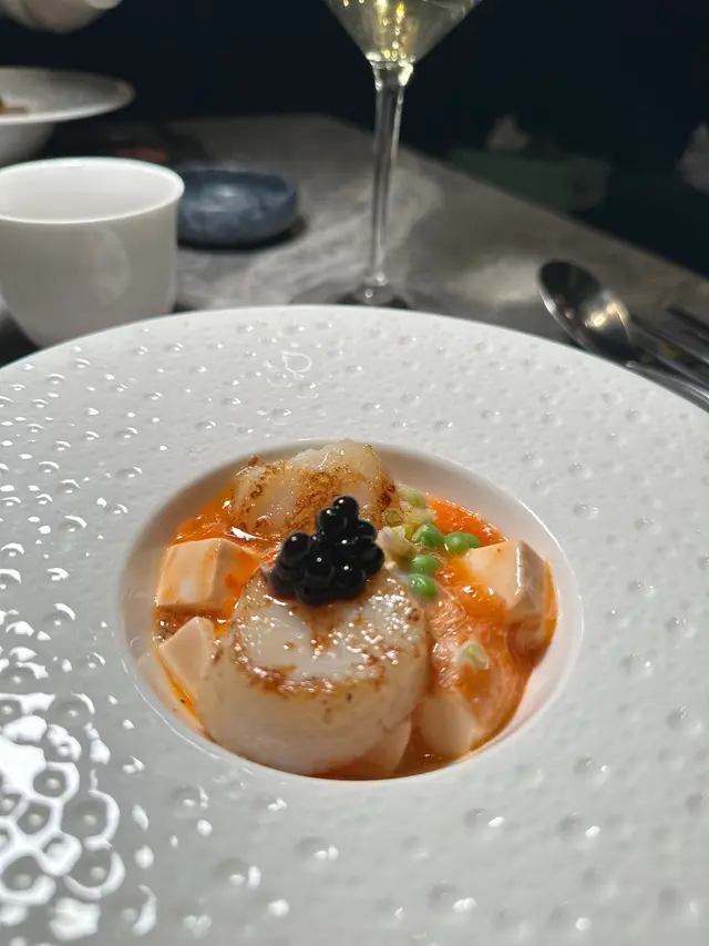 呢碟係帶子豆腐伴蟹粉,豆腐極之滑嫩細膩,兩隻巨型帶子非常鮮甜,再配上濃郁鮮香嘅蟹粉,餐廳職員還現場把黑醋珠珠放在帶子上,增添咗這度菜嘅儀式感,而且口感更為豐富。