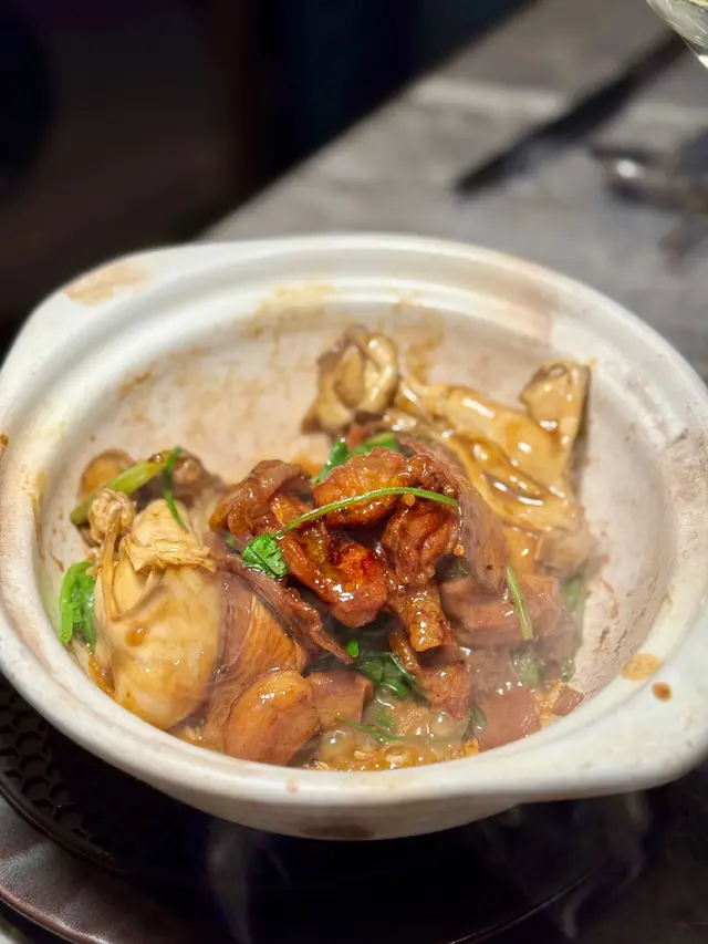 這個雞煲係師傅現場即炒,再在煲邊淋上茅台,令到雞煲充滿酒香味,而裡面嘅鮮蠔肉質非常飽滿鮮嫩,雞肉吸收咗茅台酒嘅醇香,再配埋蔥蒜,非常惹味。