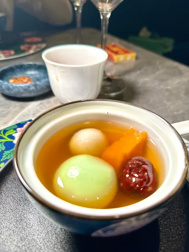 甜品都很特別,一粒綠色湯圓係椰子斑斕味和一粒白色湯圓係芝麻味,再配埋紅棗和蕃薯,啱晒冬季食,夠晒滋潤。