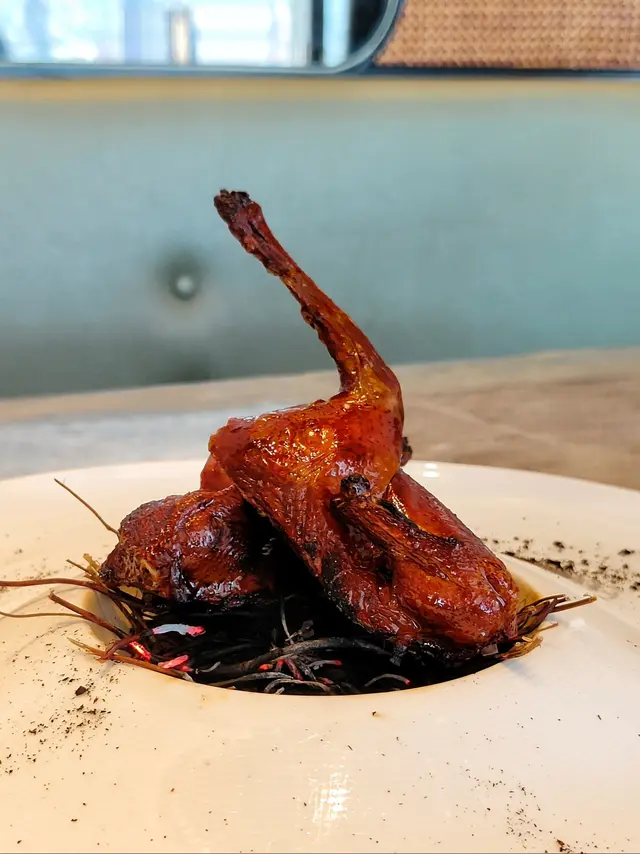 雞骨草咖啡煙燻BB鴿 $218,竟然有這個配搭欵,喜歡吃乳鴿不可錯過這個🤩。雞骨草mix咖啡,再煙燻出來的味道挺特別。吃起來有皮脆肉嫰的質感,雖然是煙燻上菜,但肉質不會感到韌,保留到鮮嫰多肉汁🤤。