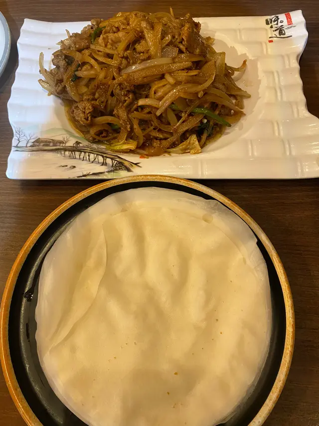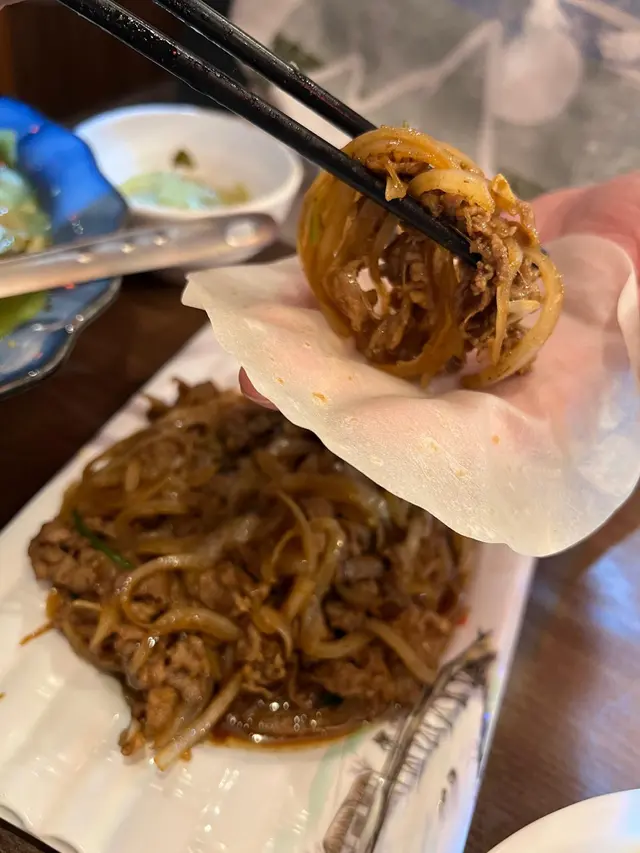 之後我哋點了孜然羊肉,這裡是包括薄粉皮一起上菜的,吃的方法就像吃片皮鴨一樣,我就試把一大啖放上薄皮上然後包著吃,就像吃了一個大大的羊肉包一樣,冇得頂!孜然配羊肉固然是絕配,用洋蔥的份量不錯,不會蓋過羊肉的香味,汁也煮得濃稠適中,所以伴飯吃也非常好