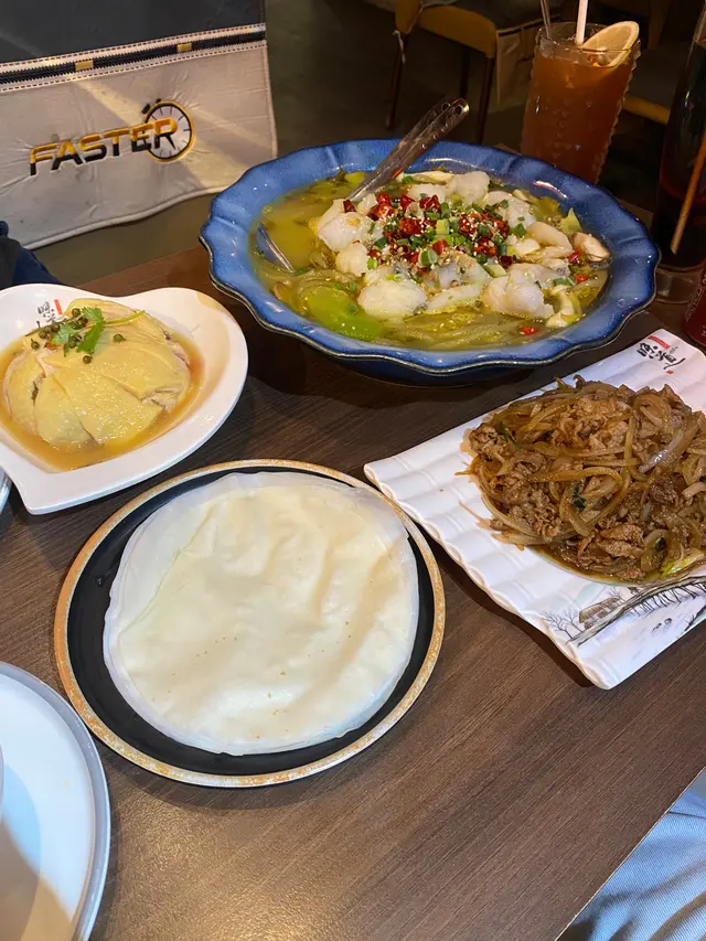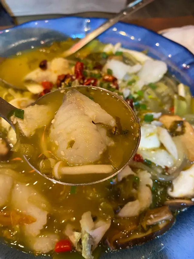 再點了招牌菜:金湯酸菜魚,起名叫金湯,當然上菜的時候第一下是呷一口湯,嘩,令人驚喜的又再一次是處理味道的平衡,麻辣俱佳,而且互相襯托不搶味道,魚片煮得剛剛好,夠熱得嚟仍保持幼滑,酸菜切得幼細,把魚片加入各樣配料,連金湯一大啖入口,豐富的口感和層次感在口腔內澎湃著,十分滋味,還有索了金湯的薯粉,伴點椒絲和葱粒吃,又可以大大碗吃完呢!