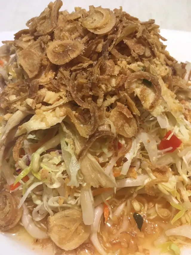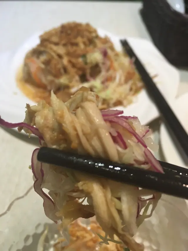 是有椰菜、芽菜、紅蘿蔔絲、炸蒜絲、雞絲,材料好豐富又健康,以菜為主;醬汁酸酸甜甜又帶一點辣,好開胃,雞絲都好正又有口感