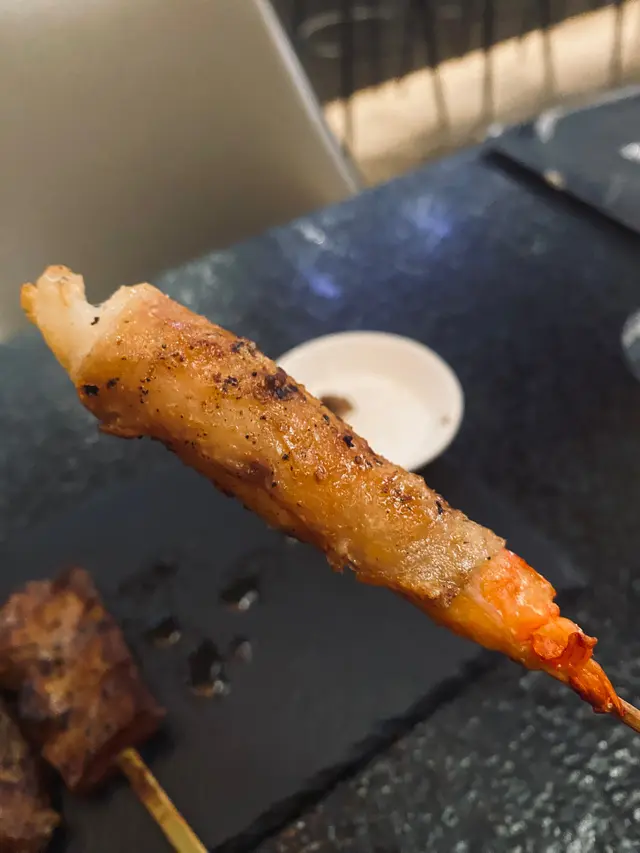 將雞皮和蝦仁串在一起燒烤,創造出獨特脆皮的口感。