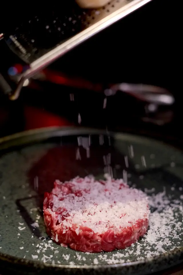 黑紅色主調就係型! 晚市二人套餐 1380/2位幾抵食! 套餐保留Beef Tartare,店員即席灑上巴馬臣芝士、白松露油,再與生蛋黃拌勻,食落香滑濃郁,停唔到口🤤