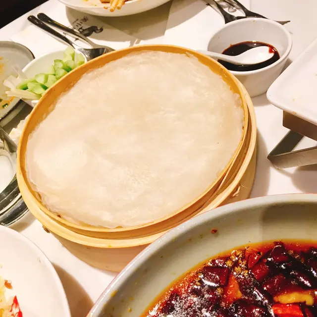 黎美中鴨子,一定要食片皮鴨,鴨皮好香脆,鴨皮連少少肉,唔會太溜,而且有好多塊粉皮,7個人,每人食到3至4件,粉皮好薄,粉皮+鴨+青瓜+蔥,點埋醬食,非常好味所以片皮鴨係必要嘅!