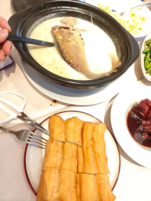 首先上桌的是鎮江排骨。這道菜以豐富的醬汁和嫩滑的肉質著稱,排骨經過精心烹製,外焦裏嫩,醬香十分濃郁,令人食指大動。接著,我們嘗試了豆漿黃魚配油條,這道菜的創意讓我們感到驚喜。黃魚新鮮細膩,豆漿醬汁的搭配讓整道菜更加豐富,外脆內軟的油條則為菜品增添了不同的口感層次。