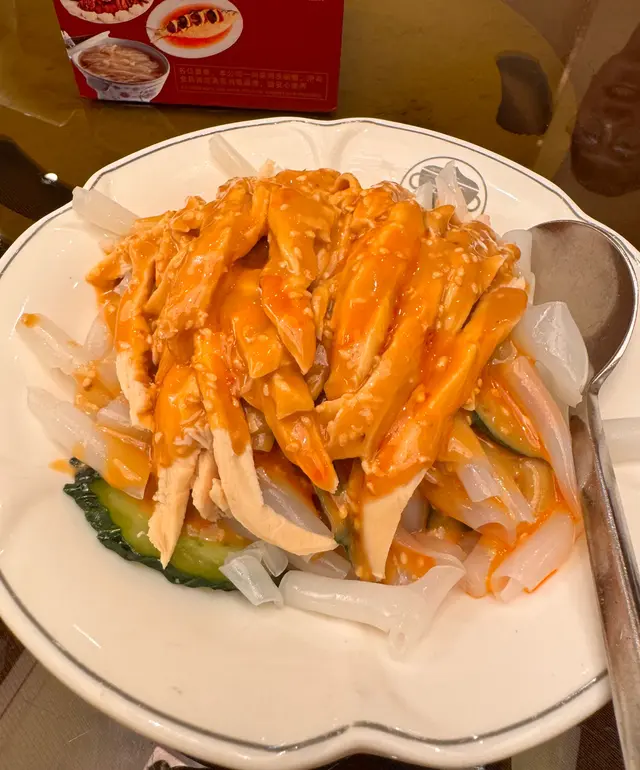 另一款前菜,嫰滑的雞絲配冰冷的粉皮,再淋上麻醬,開胃醒神。