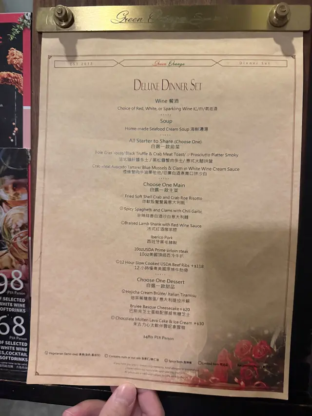 (包一杯餐酒,一個海鮮湯,一個前菜,一個主菜同一個甜品)