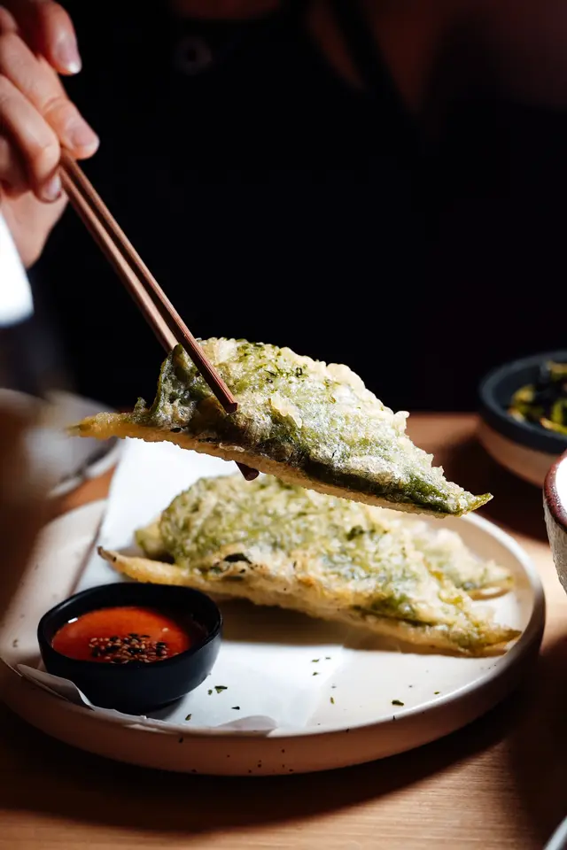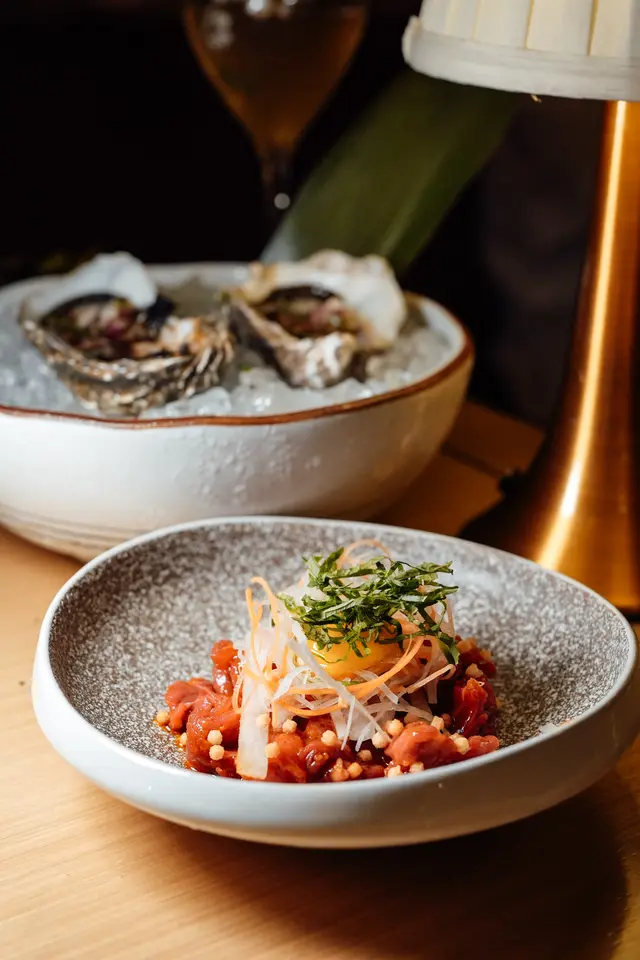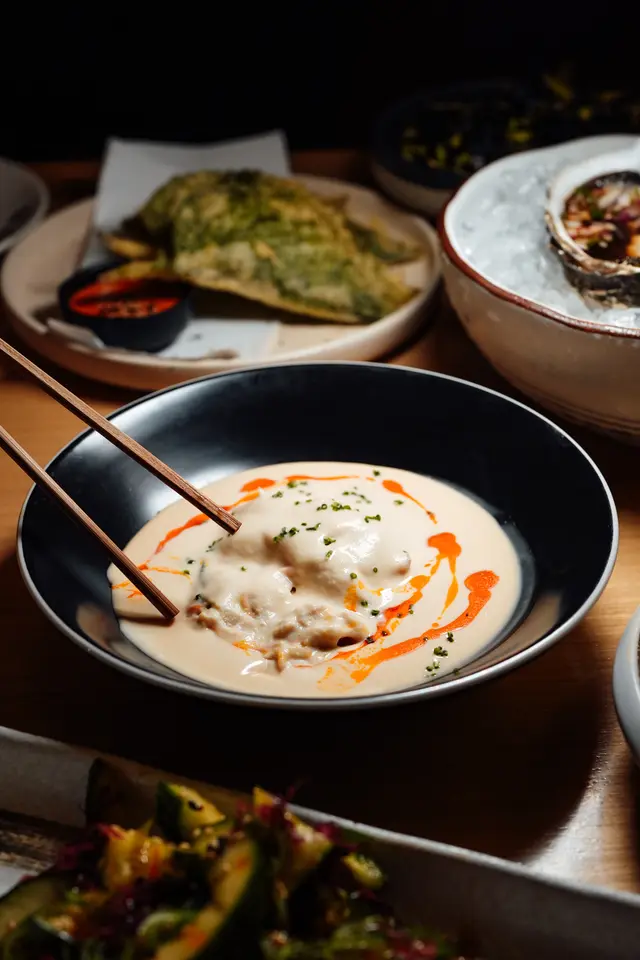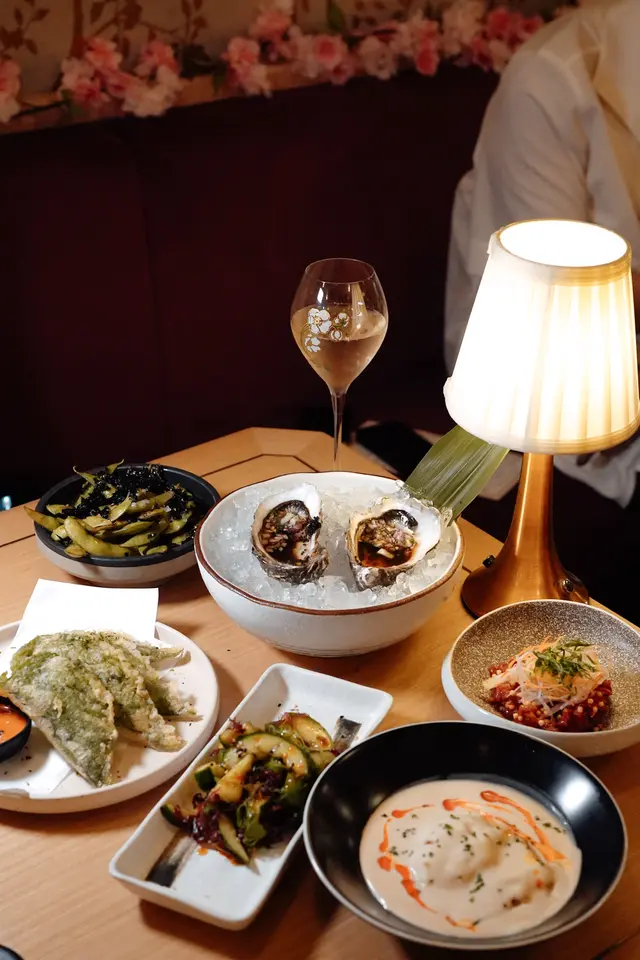 菜式非常豐富✨先有每人一隻新鮮生蠔🦪配以辛辣韓式醬汁及洋蔥莎莎醬。頭盤韓式調味炒枝豆特別香口惹味,而且混入擔擔醬雞肉沙律都甚為出色又有驚喜👍🏻另外仲有香酥紫蘇葉蝦肉天婦羅、韓式風味牛肉他他、及川味青瓜沙律🥗。